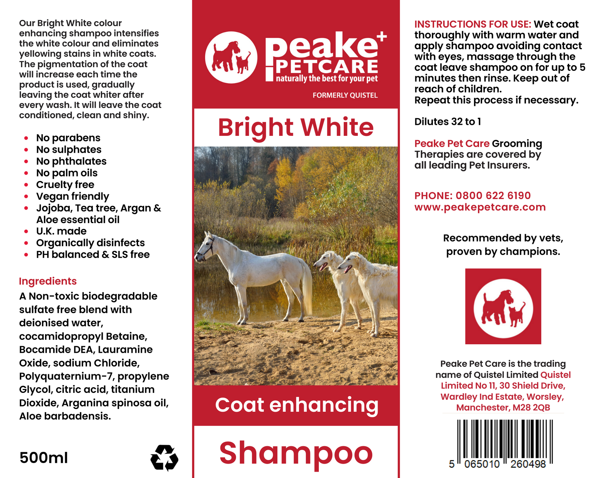 Our Bright White colour enhancing shampoo intensifies the white colour and eliminates yellowing stains in white coats. The pigmentation of the coat will increase each time the product is used, gradually leaving the coat whiter after every wash. It will leave the coat conditioned, clean and shiny.