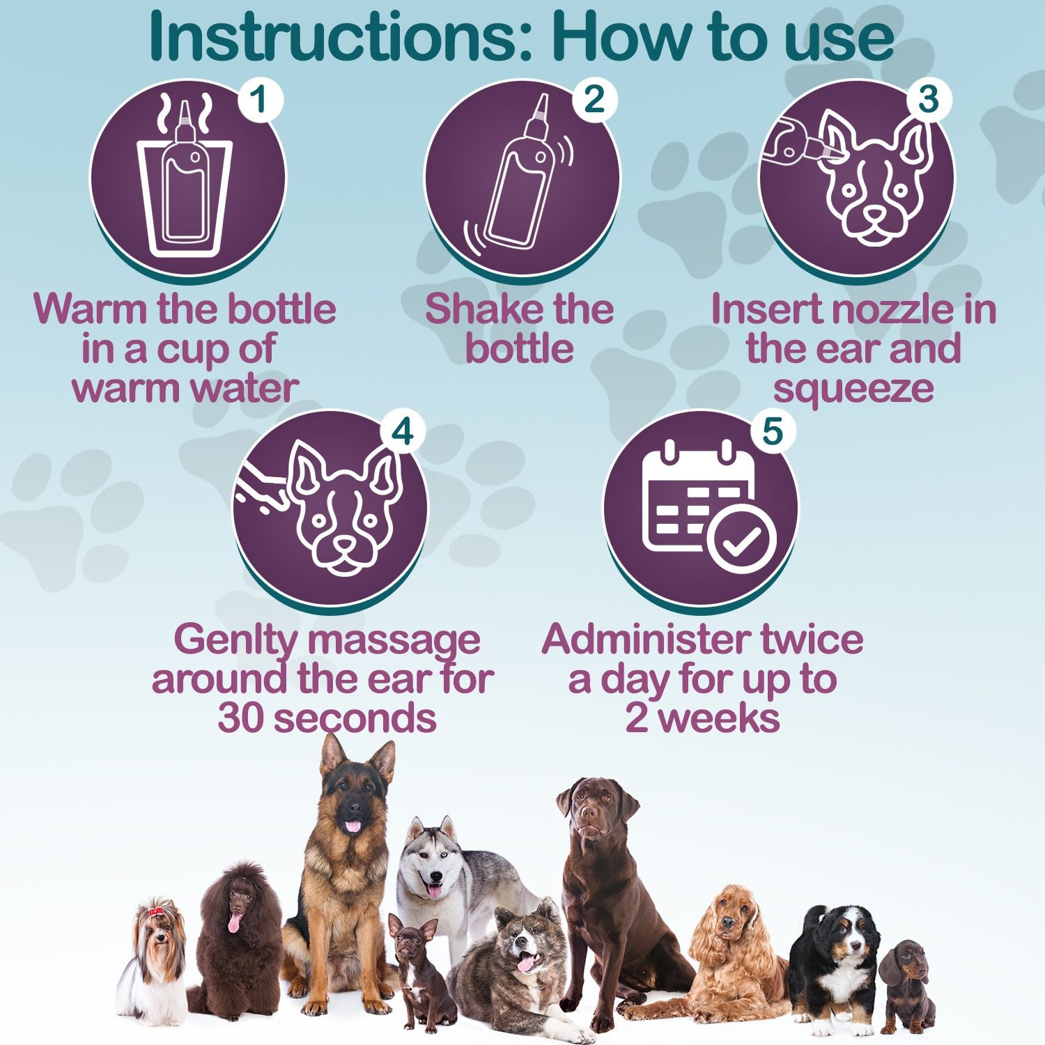 Gently massage around the ear for 30 to 50 seconds then allow your pet to shake its head which will loosen the earwax, allow the solution to penetrate the canals fully and disperses any excess solution.